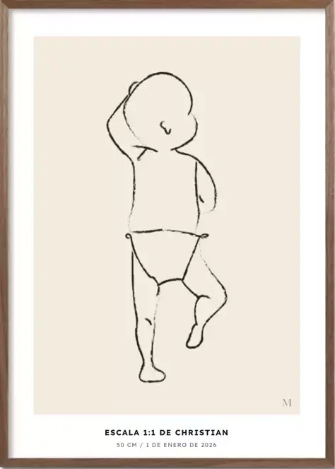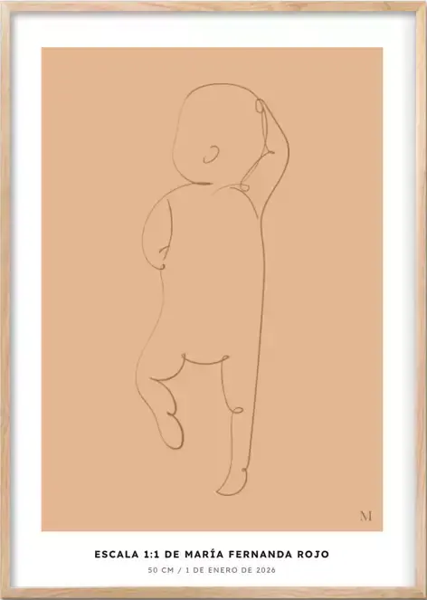 Un póster personalizado con el nombre, fecha, peso y medidas de tu bebé, impreso a tamaño 1:1. El recuerdo perfecto de lo pequeñito que era.